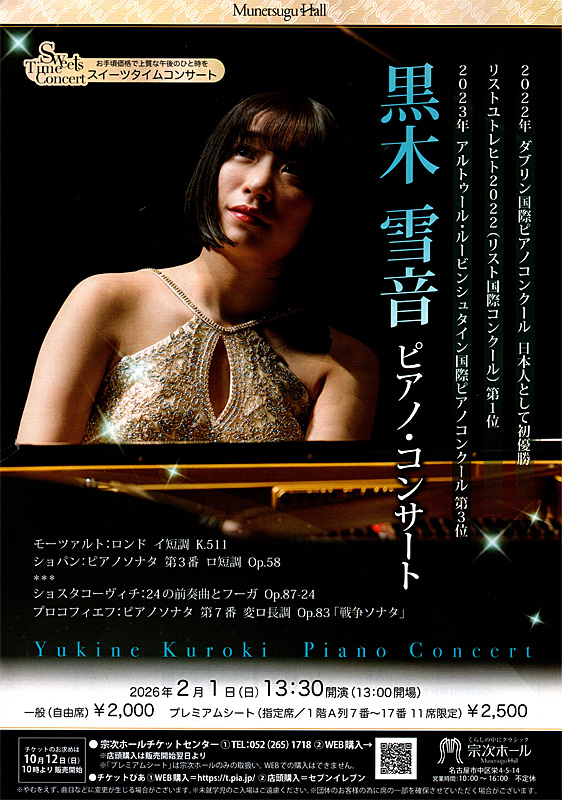 黒木 雪音 ピアノコンサート 2026年2月1日(日) 13:30開演 13:00開場 一般自由席 ¥2.000円 プレミアムシート(指定席/1階A列7番〜17番11席限定)¥2.500 宗次ホール |
