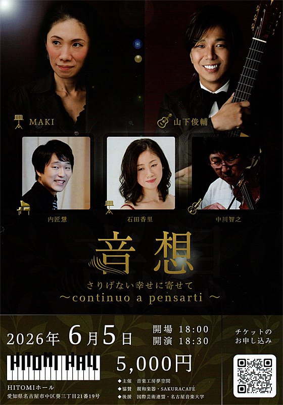 音想 さりげない幸せに寄せて continuo a pensariti 2026年6月5日 開場18:00 開演18:30 5.000円 HITOMIホール |