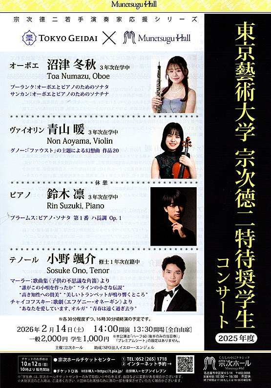 東京藝術大学 宗次徳二特待奨学生コンサート 2026年2月14日(土) 14:00開演 13:30開場 全自由席 一般:2.000円 学生:1.000円 宗次ホール |