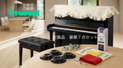 | リフレッシュ済み中古ピアノには7点セットの付属品がサービスで付きます! 高低自在椅子、トップカバー、ワックス、クロス、インシュレーター、鍵盤カバー、初回調律、当社5年保証 |