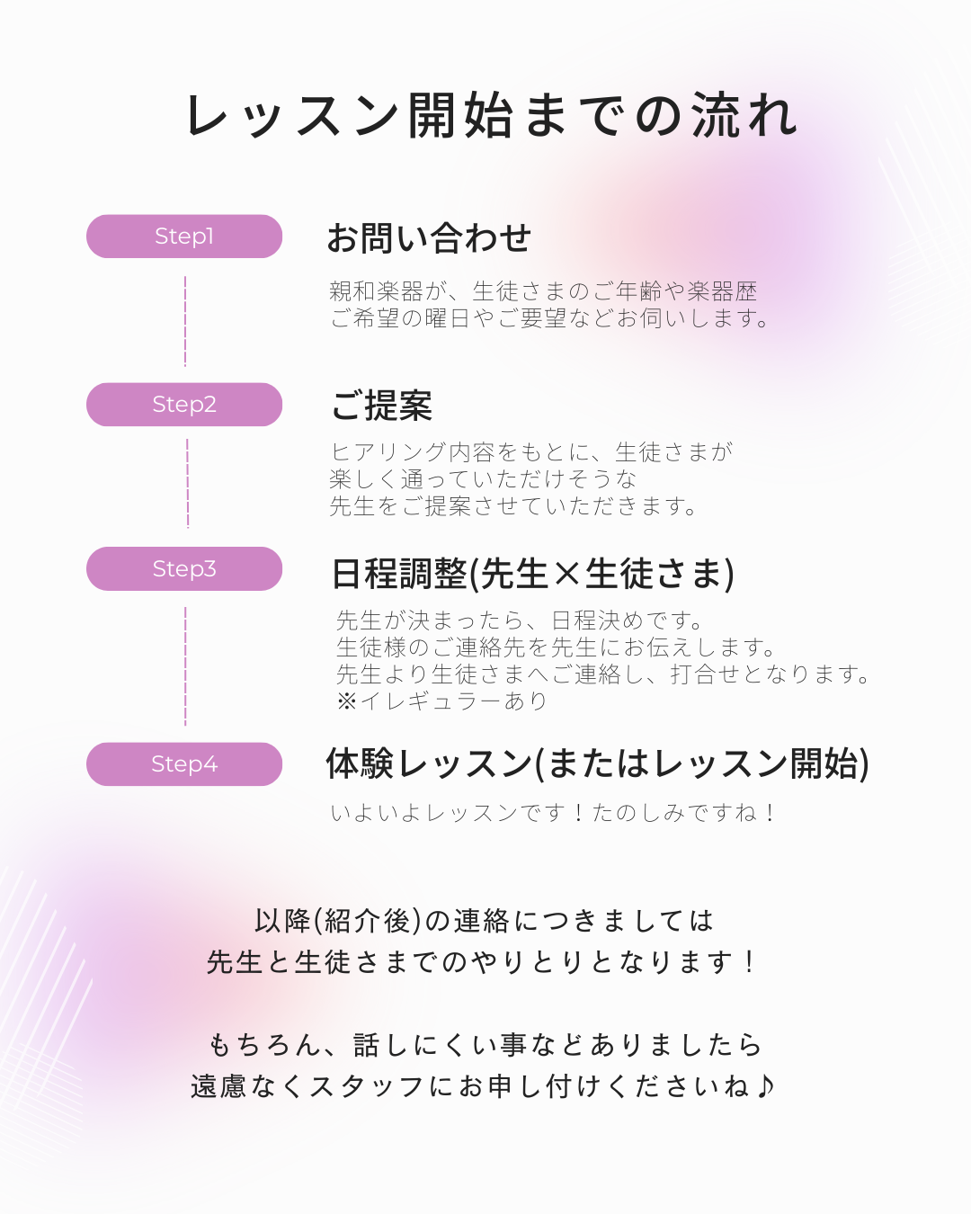 体験レッスン受付中 体験レッスン30分\2,000 +親和楽器での場合は 施設使用料\600を受付でお支払いください。 年42回 1レッスン30分〜 詳しくはこちらをご覧ください |